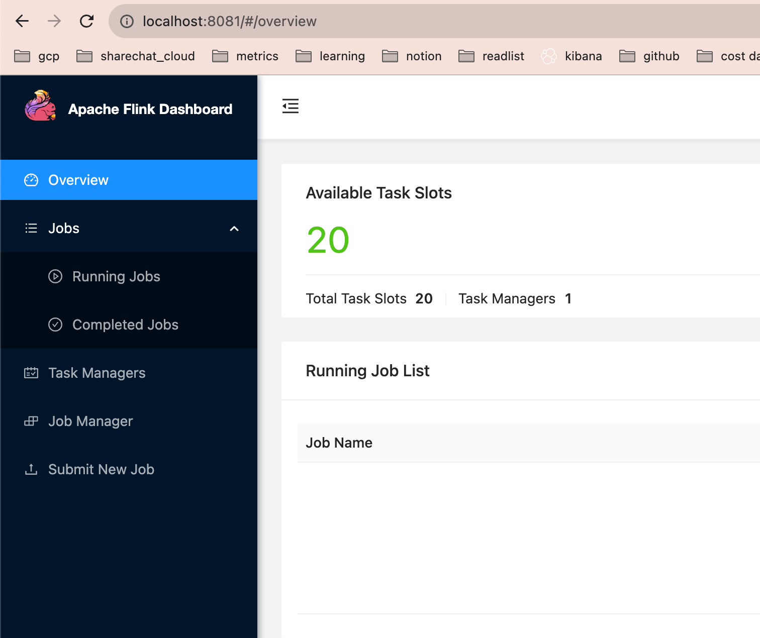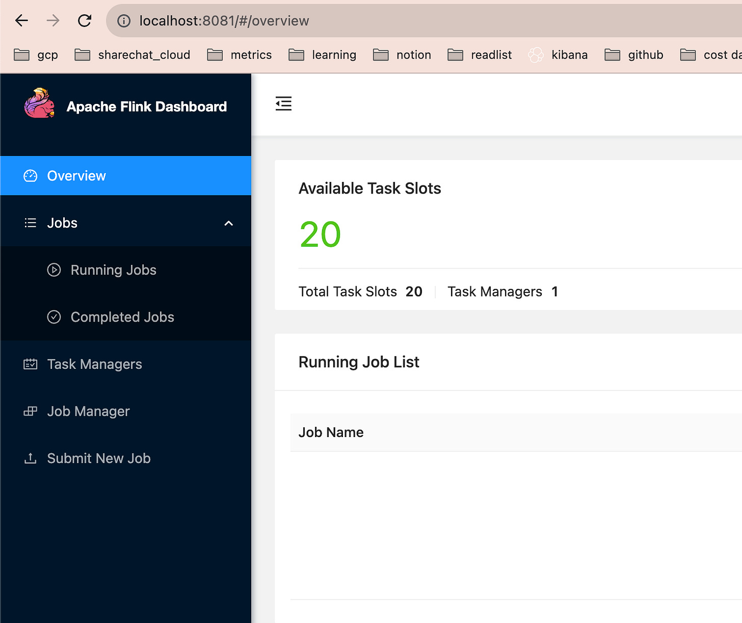 http://localhost:8081/, and you should see Flink’s WebUI, looking something like this: